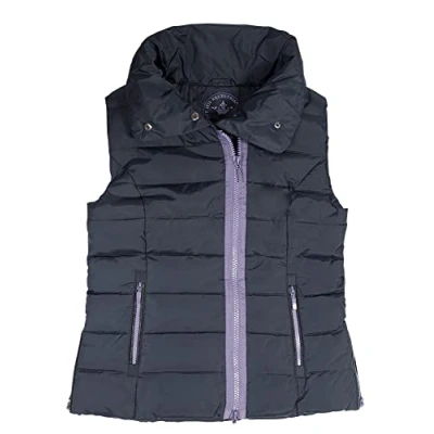 Fashionable, lined quilted vest with high stand-up collar and many colour-contrasting details Slightly tailored cut Visual highlight: slightly offset front zip, logo prints on the back and inside of the collar Two large front zip pockets Side slits with zip
