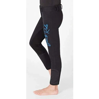 Comfortable riding breeches for children and teenagers made of a very elastic and skin-friendly cotton material. With imitation leather full seat and elastic leg cuffs. Coloured print "Born to Ride" in blue (black trousers) and in purple (medium blue trousers). With durable belt loops, a zip pocket at the front and discreet PFIFF logo on the button. Material: Outer material: 95% cotton, 5% elastane. Trim: Top: 100 % polyurethane. Bottom side: 100% cotton. Leg cuffs: 90% polyester, 10% elastane; washable up to 30 °C, please use only mild detergent.