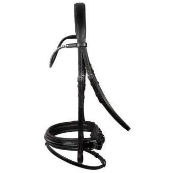 Very narrow bridle Made of high-quality leather With softly lined headpiece Silver-coloured fittings Patent leather noseband