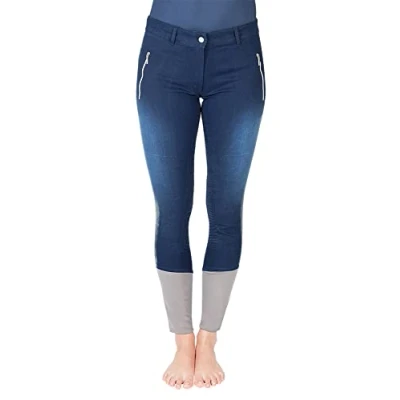 Suitable for everyday use, modern and elastic women's breeches in jeans look Silicone grip full seat Eye-catching glossy print on side seams Total of 4 zip pockets Belt loops and elastic leg cuffs