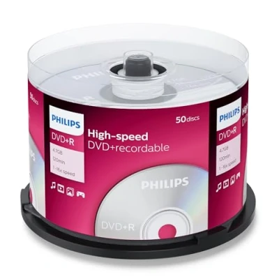 Philips DVD+R blanks are powerful and comfortable writeable storage media for standard DVD burners and DVD players (DVD players, Playstation, XBOX, etc.) The storage capacity is 4.7 Gigabyte. This corresponds to a video playing time of 120 minutes. Speed: 1-16X The compact "cake box" contains 50 blanks. Philips blanks have a very long archival life for a particularly long user experience. Philips sizes and formats: DVD-R, DVD+R, 25 spindle, 50 spindle, 100 spindle, 4.7 GB, 120 min, 16x, 8.5 GB, 240 min, 8x, inkjet printable. Please note that the product comes in two packaging variations. This is not a mistake as Philips packaging design changes from 2020.
