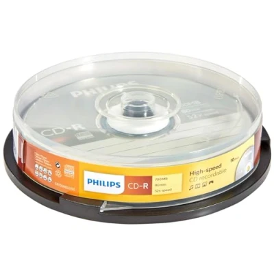 Philips CD-R blanks are powerful and convenient recordable storage media for common CD burners and CD players (stereo systems, car radios, DiscMan, computer drives) The storage capacity is 700 megabytes, which corresponds to a playing time of 80 minutes. Speed: 1-52x. The compact "cakebox" contains 10 blank discs. Philips blank discs have a very long archival lifespan for a particularly long user experience. A spindle is a plastic cylinder that stores individual compact discs. The spindle is sealed with a plastic lid to protect the discs. A spindle saves space and is ideal when a large number of discs are needed and/or when discs are used only infrequently, e.g., for backups. Spindles are available with 10, 25, 50, or 100 discs. The 25-disc spindle is also available with inkjet-printable discs (IW).