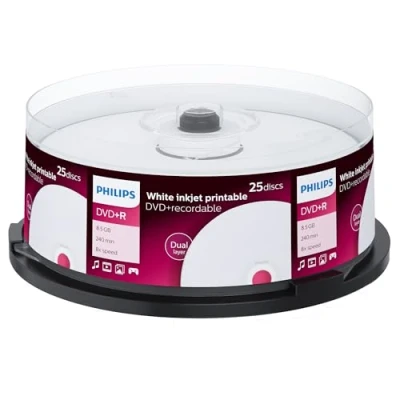 Philips DVD+R blanks are powerful and convenient writeable storage media for common DVD burners and DVD players (DVD player, Playstation, XBOX, etc.) The storage capacity is 8.5 gigabytes. This corresponds to a video playtime of 240 minutes. As an inkjet printable version, you can print the surface according to your wishes. Speed: 8X The compact cake box contains 25 blanks. Philips blanks have a very long archival life for an extra long user experience. Philips Sizes and formats: DVD-R, DVD+R, 25 spindle, 50 spindle, 100 spindle, 4.7 GB, 120 min, 16x, 8.5 GB, 240 min, 8x, inkjet printable. Please note that the product comes in two packaging variants. This is not a mistake, as a change of packaging design will take place at Philips from 2020.
