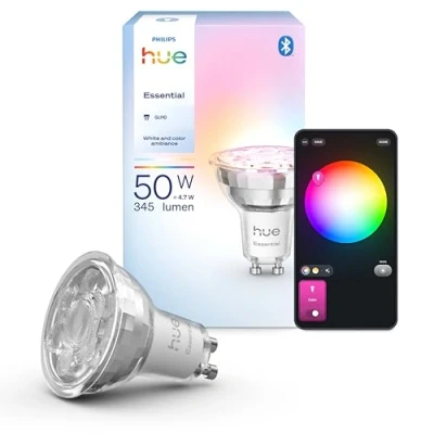 Philips Hue Essential Smart LED GU10 Spotlight, White and Color Ambiance, 4.7W, 2200K 6500K, 345 Lumens, Dimmable, Works with Alexa, Google Assistant, Apple Home, 1 Pack