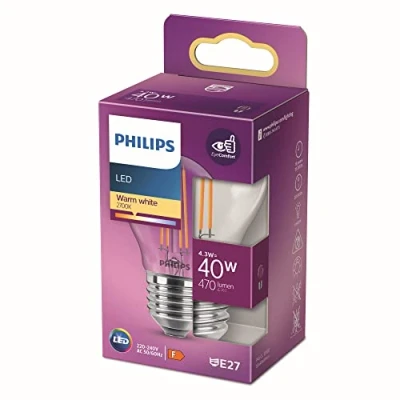 With this LED ball bulb from Philips you have the perfect replacement for your old light bulb. The 4.3W bulb has clear glass so that the filament is clearly visible and the bulb always stands out. This fits on an E27 fitting. The bulb emits warm white light with a luminous flux of 470 lumen and a colour temperature of 2700K. The bulb also has the EyeComfort quality mark which means that the light it produces is less intense to better suit your eyes. That makes this bulb suitable for both living rooms and bedrooms. With normal use of approximately 2.7 hours per day, it will last more than 15 years.