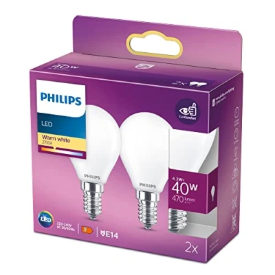 Philips LED Premium Classic P45 Lustre Light Bulb 2 Pack [E14 Small Edison Screw] 4.3w 40W Equivalent, Warm White (2700K), Non Dimmable, A++