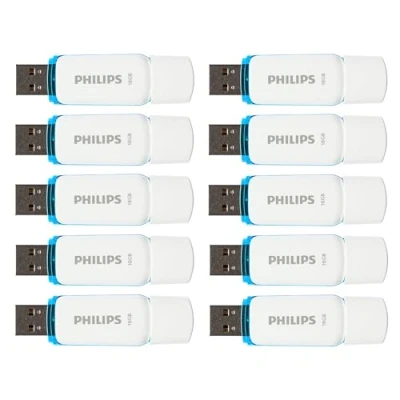 With 10x 16GB storage capacity, you have enough capacity to store more than 4,500 of your favourite photos or 2,800 MP3 music files*, *) Based on 10MP jpg compressed photos and 3-minute MP3 files (256kp/s, 5.7MB size). High-speed USB 2.0 data transfer: The Philips Snow USB Flash Drive is a fast and reliable medium that allows you to read and write all your favourite files such as photos and music. A handy LED indicator shows you whether the drive is properly connected and it is working properly. The indicator flashes when copying. The compact pocket-sized storage that lets you take your favourite music, videos and photos with you wherever you go. With cap to protect the USB port. During use, the cap can be easily inserted on the back of the flash drive. Includes practical eyelet for attaching to a key chain. Box contents: Philips Snow High Speed USB 2.0 Flash Drive 10 x 16 GB, easy and reliable to use, suitable for backup storage, white/blue