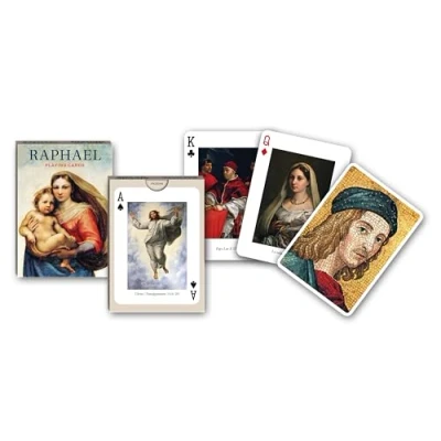 Playing cards in poker format with motifs of the world famous painter Raphael Raphael gained fame especially as a painter for his harmonious and balanced compositions and lovely Madonna paintings This collector's edition contains 52 playing cards + 2 jokers + 1 info card In addition to his career as a painter in Florence and at the papal court in Rome, he also became construction manager of St. Peter's Basilica and overseer over Roman antiquities., Manufacturer: Piatnik