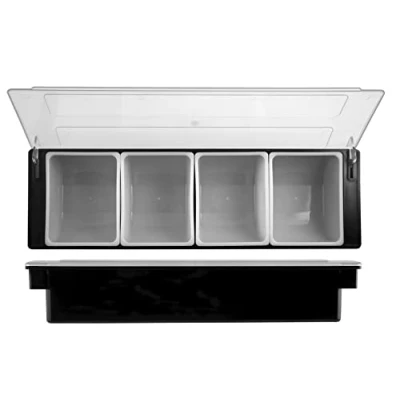 PIAZZA Condiment holder 4Ps table item USE - Accessory for the bar. DIMENSIONS - With 4 containers. 49 x 15 x 9 cm. With removable compartments, this condiment holder is the perfect solution for separating your toppings in a neat and concise order. Make sure your toppings stay fresh thanks to the transparent lid that allows you to view the contents.