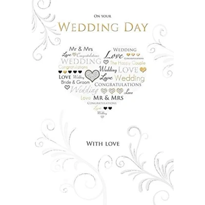 High quality greeting card and envelope Caption: Wedding Description: Wedding Day Text Heart Approximate size (inches): 9 x 6 Designed and made in the UK