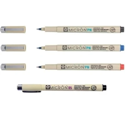 Sakura Pigma Micron PN.Set of 3 Pigma Micron Everyday Pens. Made in Japan +1 BLACK Ideal for sketching and drawing or mixing with water to serve watercolours Permanent ink, water resistant, light, colour-fast. The ink dries quickly, does not pass through the paper and is PH neutral Durable plastic dot prevents scratches on paper and allows smooth writing. Stroke width: 0.4 mm - 0.5 mm Universal pen for writing, drawing and painting. Extra long peak life for everyday use.