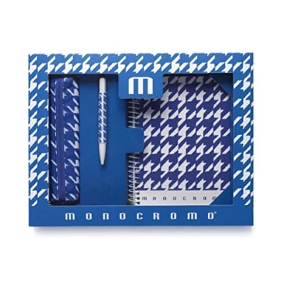 Monochrome Special Box - Blue The most iconic patterns of the fashion world redesigned by Fedez and adapted to the world of paper 1 DPUBLE REVERSE A5 NOTEBOOK WITH SPIRALE: White spiral with white single-coated cardboard cover printed 1/0, two first printed sheets 1/1, 45 ff rows + 45 ff neutral 80 g. + 5 ff coloured paper dividers 1 ZIP CASE: Gold-colored zip, interior lined with Monochrome logo tone on tone, colorful and personalized zip puller 1 PEN: With gel ink black color