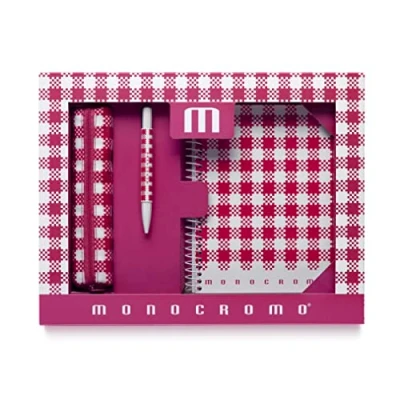 Monochrome Special Box - Fuchsia The most iconic patterns of the fashion world redesigned by Fedez and adapted to the world of paper 1 DOUBLE REVERSE A5 NOTEBOOK WITH SPIRALE: White spiral with white cardboard cover monopatinated printed 1/0, two first printed sheets 1/1, 45 ff rows + 45 ff neutral 80 g. + 5 ff coloured paper dividers 1 ZIP CASE: Gold-colored zip, interior lined with Monochrome logo tone on tone, colorful and personalized zip puller 1 PEN: With gel ink black color