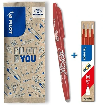 Erasable rollerball pen: perfect for quick and clean correction of errors Pleasant writing thanks to the rubberised grip area. For right and left handed users Refillable again and again with the Pilot BLS-FR7 (2261) refill Long service life thanks to high-quality stainless steel tip. Box contents: 1 rollerball pen in red ink and 3 x red refills