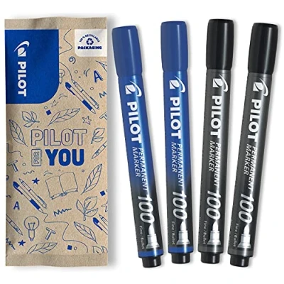Permanent marker with attractive design and new high-performance C.S.P. ink technology (Controlled Surface Properties) Delivers bold colours with high brilliance and provides high abrasion resistance to various surfaces (wood, plastic, metal, foil, etc.) Light and water resistant Long cap off time of 24 hours, so that the PILOT 100 can remain open even overnight Bullet tip with 1 mm line width. Set of 4 assorted colours: blue, black.