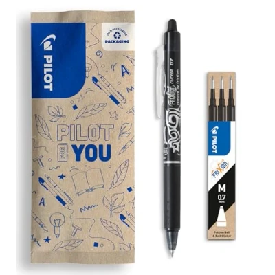 ๐๏ธ Ideal concept: The Frixion Ball Clicker erasable pen allows you to write, erase and rewrite without crossing anything out. No more tearing pages out and starting again, just erase what you want to change without leaving a trace, and immediately rewrite. ๐๏ธ Frixion Ball Clicker 0.7 offers medium-sized writing. Its 0.7mm diameter tip is resistant to drops and shocks, offering smooth writing without smudging. Perfect for all your note taking, memos, diary or crosswords/sudoku. ๐๏ธ Ultra practical 2-in-1 erasable pen: When you change your mind or make a mistake thereโs no need to start again, just erase with a stroke of the eraser. Your writing stays clear, readable and free of eraser marks. It saves you time so you can focus on your work. ๐๏ธ Pilot Thermosensitive Ink: the erasable gel ink pen provides a smooth and comfortable writing experience. Frixion Ball Clicker pen is available in 8 different colours, all erasable and refillable. ๐๏ธ Ergonomic retractable pen: this gel ink roller pen boasts a grip that ensures a comfortable hold. Its body is crafted from sturdy materials that ensure a long life. Its patented PILOT clip allows the tip to pop out or retract with just one click. It clips onto your documents, planners and books so you can bring your Frixion Ball Clicker pen everywhere with you on the go.