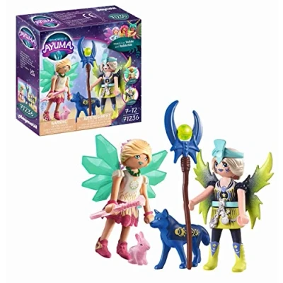 Moon Fairy Stellara and her soul animal wolf and crystal fairy Miriel with soul animal rabbit like each other very much, at least as long as the moon does not shine purple over Ayuma. With purple moon, the Moon Fairy is ruled by the fog and mean Experience the fantastic animation series Adventures of Ayuma on YouTube and YouTube Kids. Let your favourite characters come to life at home with the PLAYMOBIL playset and immerse yourself in a mystical world full of magic and adventure Toy figure set for children from 7 years: ideal for children's hands due to age-appropriate size and pleasant feel with rounded edges Daily use: high-quality and robust design, clean the parts (without stickers) under running water without chemical agents Box contents: 16-piece toy figure set with instructions: 2 figures, 2 animals, 12 accessories, individually set up, weight: 36 g, 71236, Manufacturer: Playmobil