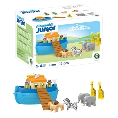 Animal adventure: discover Noah's take-away ark! With carry handle, ramp and hinged roof. All animals can be loaded and the fascinating world of animals can be explored. Are all pairs of animals complete? Then you're ready to go! Fun for children from 1 year: The PLAYMOBIL Junior sets are ideal for children's hands due to age-appropriate size and pleasant feel with rounded edges. With attractive features for first toddler-friendly discoveries. Safe playing: PLAYMOBIL Junior stands for the greatest possible safety of your child. The sets are made in the EU and are free from plasticisers and small parts that can be swallowed - for maximum fun The original: PLAYMOBIL has stood for high quality and robust design since 1974. Sustainability: All PLAYMOBIL Junior playsets are made from over 90% bio-based plastic (ISCC PLUS certified). The plastic can be traced back to its bio-based raw material via the mass balance approach. This makes a decisive contribution to reducing the consumption of fossil resources. Box contents: 15-piece toy figure set with instructions: 2 figures, 9 animals, 4 accessories, material: plastic, L x D x H: 32.5 x 22.5 x 20 cm, weight: 1161 g, 71681, Manufacturer: Playmobil