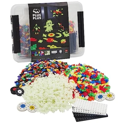 This Plus Plus XXL storage box includes everything you need to start with Plus-Plus It is 40 x 12 x 30 cm in size and has a capacity of 2000 creative building blocks (700 basic, 700 neon and 600 glow-in-the-dark / glow-in-the-dark), 4 peg plates and 12 wheels. Whether mosaic picture, landscapes, jewellery, cars or animals in 2D or 3D - Plus-Plus transforms children into imaginative builders and artists. Creativity is playfully promoted when designing with the puzzle piece-shaped building blocks. Inventing scenarios and combining the components creates a high fun factor and thus a positive influence on the development of children. The building blocks are made in Denmark using a high-quality injection moulding process from plastic, which is free from PVC, BPA and phthalates. For children aged 5 to 12 years, Plus-Plus construction games are ideal, but they also provide fun and play for adults and children over 12 years., Manufacturer: Plus-Plus