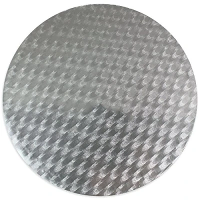 Perfect to use as base of any celebration cake, gateaux or for use in-between stacked cakes Diameter: 406 mm (16") Strong white card, 3 mm (¼") thick Metallic silver finish Made from cardboard