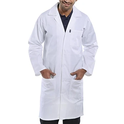 65% polyester, 35% cotton Concealed stud front 1 breast pocket with pen divide 2 lower pockets