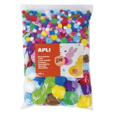 Assorted colour pompoms: yellow, orange, red, fuchsia, lilac, pink, sky blue, dark blue, green, light green, brown and white. Each pack contains 500 pompoms in assorted sizes: Ø 50 mm (15 pcs. ), Ø 40 mm (20 pcs. ), Ø 35 mm (15 pcs. ), Ø 25 mm (50 pcs. ), Ø 20 mm (100 pcs. ), Ø 15 mm (100 pcs.) and Ø 10 mm (200 pcs. ). MAXI format, ideal for schools. Basic product for schools and children's workshops, ideal for creating garlands, decorations, necklaces, costumes, clothing applications or other crafts. Ideal for stimulating children's imagination and creativity