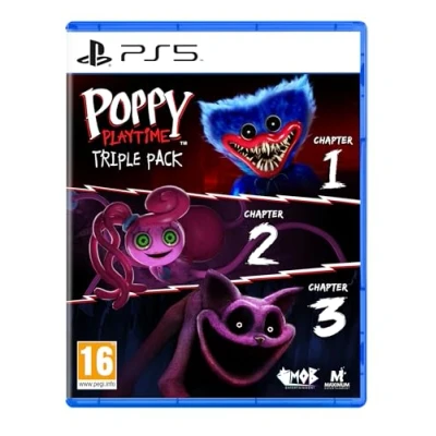 This pack contains the first three chapters in the Poppy Playtime saga. Each chapter features engaging new toy characters that can be either friend or foe. Survive and progress by solving challenging puzzles. Each game reveals to you a newly discovered area of the massive toy factory. The Poppy Playtime Triple Pack includes a reversible coversheet and a Poppy Playtime sticker sheet!, Platforms: PlayStation 5