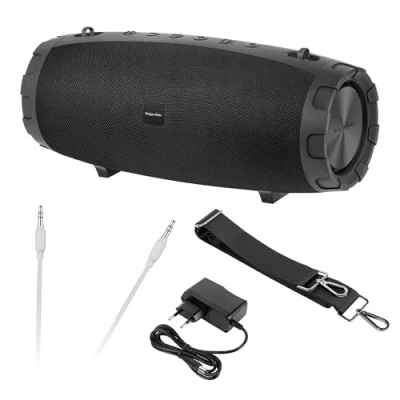 The EXPLORER+ speaker impresses with its excellent and balanced sound. The TWS function allows you to connect two speakers together for even better sound quality. The speaker is ideal for any party, whether at home or outside in the garden. Wbudowany akumulator: 6000 mAh umożliwia odtwarzanie muzyki do 8 godzin (przy najwyższej głośności) oraz naładowanie np. telefonu Play music from microSD card or USB media. The AUX connector allows you to connect an external sound source. Bluetooth 5.0: Enjoy your music from your smartphone, tablet, laptop or other devices without the hassle of wire.