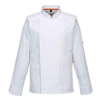 FUNCTIONALITY: MeshAir Pro Jacket Features of this jacket include double breasted concealed stud front fastening, apron tab at the back of the neck and large MeshAir Pro panels at the back and underarms for outstanding breathability. PRACTICAL: MeshAir Pro Jacket Designed with MeshAir Pro mesh aerated panels, Durable polyester/cotton fabric with Texpel stain resistant finish. C838 chefs jacket uses a lightweight fabric and offers a modern, slimmer silhouette with an ergonomic fit. PRODUCT CARE: Maximum washing temperature 60°C Normal process, do not bleach, Tumble dry low, Iron max 150°C, professional dry cleaning in tetrachloroethene, normal process. Wash dark colours separately. MATERIAL, SIZE AND RANGE: MeshAir Pro Jacket L/S. White (S-XXXL), Black (S-XXXL) and Slate Grey (S-XXXL). Shell Fabric : 65% Polyester, 35% Cotton 190g. Contrast Fabric : 100% Polyester Mesh 140g.