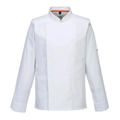 DESIGN AND FUNCTIONALITY: MeshAir aerated mesh fabric on underarm gusset to increase air flow. Superior styling with French cuffs. Concealed stud front for easy access. Apron tab ensures secure placement of your apron. Slim fit design for exceptional comfort. Non shrinking to ensure that this style maintains its shape wash after wash. 1 pocket for secure storage. Premium stain resistant finish repels oil, water and grime. MATERIALS, SIZE AND RANGE: Shell Fabric: Kingsmill with Texpel Finish: 65 Percent Polyester, 35 Percent Cotton. Shell Composition: 65 Percent Polyester, 35 Percent Cotton. Contrast Fabric: MeshAir Pro: 100 Percent Polyester Mesh. Contrast Composition: 100 Percent Polyester Mesh. PRODUCT CARE: Max wash temp 60°C, normal process. Do not bleach. Tumble dry low. Iron max 150°C. Professional dry clean, Tetrachloroethene, normal process.