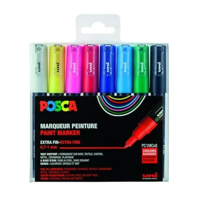 AmazonWater-based paint markers with colourfast pigments Suitable for all surfaces such as paper, cardboard, wood, clay, metal, textiles, ceramics, porcelain, plastic etc. Colours can be watercoloured, mixable and can be painted over With extra fine bullet tip for colouring, drawing, designing, marking and writing Set of 8 in different colours, Manufacturer: Mitsubishi