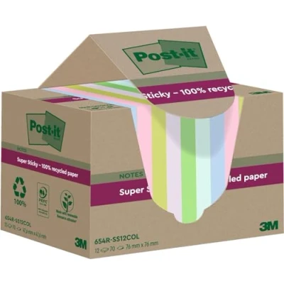 Post it Super Sticky 100% Recycled Notes, Pack of 12 Pads, 70 Sheets per Pad, 76 mm x mm, Pink, Green, Blue, Purple, Yellow Extra Notes Made from Paper