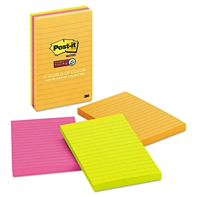 Post it Super Sticky Large Notes, Assorted Colours, Lined, 101 mm x 152 mm, 90 Sheets/Pad, 3 Pads Self Stick Notes for Note Taking, to Do Lists & Reminders
