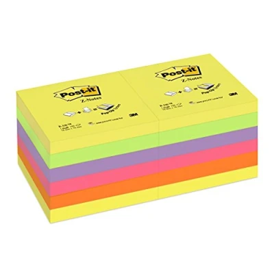 Post it Z Notes Assorted Neon Colours, Pack of 12 Pads, 100 Sheets per Pad, 76 mm x Self stick For Note Taking, To Do Lists & Reminders