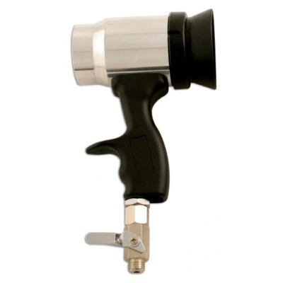 Air blow gun with adjustable air flow. For use with water based paints. Maximum working pressure 90 psi. Complete with replaceable/cleanable filter to prevent airborne particles contaminating the paint. Great for spot repair. Can be used by hand or on a stand.