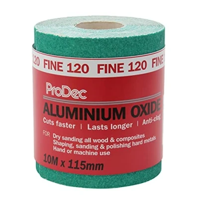 Trade quality general purpose aluminium oxide for hand or machine sanding of wood, paint, plaster, fillers, metal and more Resin-over-resin bonded abrasive lasts up to 10 times longer than sandpaper and other silicon carbide abrasives and gives an ultra smooth, even surface ready for painting, priming, staining or varnishing Crack resistant backing paper that is easily cut to size and can handle curved, moulded and irregular surfaces without falling apart 120 grit Fine grade suitable for final sanding prior to applying a first coat of paint or varnish to wood, smoothing surface imperfections, removing texture on plaster and fillers and removing water stains on wood. Not suitable for removing paint or varnish. 10m roll length x 115mm width ideal for machine/electric sanders and hand/manual sanders