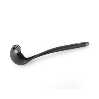 An essential addition to any kitchen, this Progress nylon ladle with soft touch handle is ideal for serving and stirring. Made from durable nylon, this kitchen utensil can be used safely on non-stick pans and has a soft touch handle for comfort while cooking. Featuring an integrated measuring guide, ideal for serving portions of soup and adding stock and broth to dishes. Sleek black with a shimmer green cuff, this ladle looks great in any setting and features a hanging loop for easy storage. Easy to clean with hot soapy water, this ladle compliments any kitchen tool collection and is suited to a range of colour schemes., Weight: 0.220462262 Pounds, Manufacturer: Progress