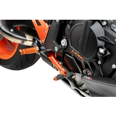 Puig 22207T gear lever in orange with sporty and modern design; improves the aesthetics and ergonomics of the set thanks to its elegant finish and its adjustable functionality designed for the demanding rider. Made from high quality machined aluminum from solid block and treated with orange anodizing that provides lightness, durability, corrosion resistance and easy aesthetic integration with most motorcycles. It has a radially adjustable toe cap to adjust its position precisely to the user's preferences and riding style; ensures greater control, adaptability and comfort on short or long journeys. The base incorporates rubber with non-slip grooves that improve touch and grip during use, even with gloves or in adverse conditions; offers safety, constant control and firm feel when triggering the shift. Compatible Motorcycles: KTM 990 DUKE 2024; KTM 990 DUKE 2025; KTM 990 DUKE R 2024; KTM 990 DUKE R 2025.