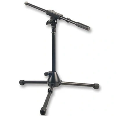 Small mini boom microphone stand for kick drum, snare or guitar amps Folding, tripod metal base with rubber feet Thumb screw clamp for boom arm and tripod base Height 460mm, length 500mm Supplied with cable clips and ⅜" to ⅝" adaptor Dimensions are 585 × 95 × 90 Centimeter
