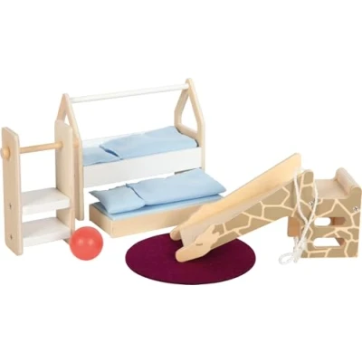 A modern furniture set for the doll house nursery with lots of play possibilities 1 house-shaped bed with 1 pillow and 1 blanket, 1 guest bed with 1 pillow and 1 blanket, 1 slide, 1 shelf, 1 jump rope, 1 ball, 1 rug This doll house furniture set promotes the development of children's creativity and social skills in a fun way Furnishing the nursery and acting out everyday scenarios strengthens motor skills Loft bed: approx. 15 x 6 x 13 cm, Manufacturer: small foot