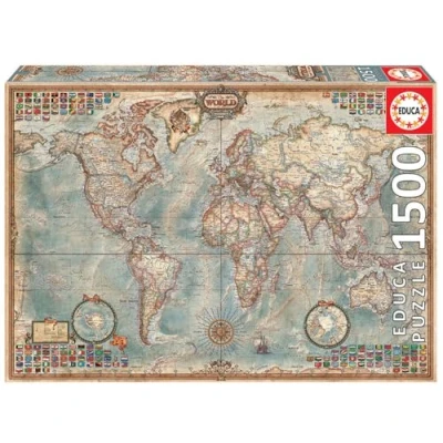 Discover a nostalgic world map with many exciting details with the high-quality 1500-piece puzzle "Antique Map". Educa: Robust and precise puzzle quality from Spain. The FSC certified puzzles are made according to strict safety and quality controls and only from high-quality, recyclable and environmentally friendly raw materials. The beautiful motifs can be puzzled again and again or hung up after laying e.g. as a decoration. The high-quality box serves as a motif template and storage. Puzzles are a pleasant and creative activity in everyday life - whether as a pastime, for relaxation, as a challenging hobby, to promote concentration or simply against boredom. Contents: 1500 piece Educa puzzle, laid size: 85 x 60 cm. Includes puzzle glue. Recommended for ages 14 and up., Manufacturer: Educa Borras