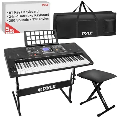 Pyle 61 Keys 2 in 1 Play and Sing Along Portable Electronic Piano Keyboard with Weatherproof Case Bag, Stool, Stand, Black