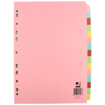 The tabs on this Q-Connect fifteen part divider have been left blank to allow you to customise it with your own labels, Each sheet is a different colour, enabling you to colour code your documents as you wish, It has been multi-punched to fit standard A4 ring binders and lever arch files 15-part tabbed dividers Ideal for office and home filing Multicoloured so you can colour-code sections Tabs have been left blank for you to customise Punched to fit all standard A4 ring binders or lever arch files 100% recycled 160gsm card