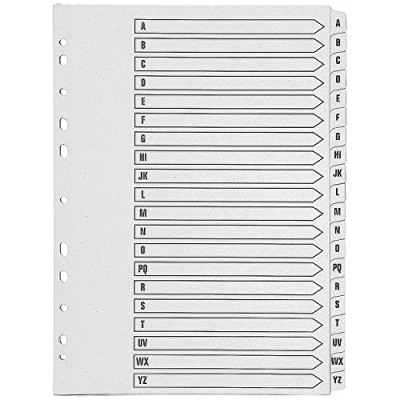 AmazonMade of durable polypropylene and divided alphabetically, this Q-Connect A-Z Index will help you to organise your filing, A front index card allows you to label your notes for quick and easy referencing, Multi-punched to fit standard A4 ring binders and lever arch files, this 20-part index is pre-printed A-Z and comes in a pack of 1 Alphabetical 20-part indexed dividers Pre-printed with A-Z tabs Made from durable polypropylene Index sheet provided to help label up your filing Hole punched to fit standard A4 binders, files and folders