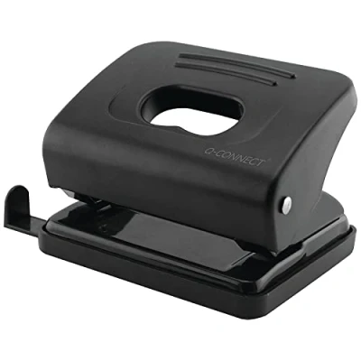 AmazonThis Q-Connect Medium Duty 2-hole punch has a punching capacity of up to 20 sheets of 80gsm paper and features a textured plastic handle for comfortable operation, The black hole punch includes a handle lock down device for storage and a pull-out paper measuring guide for accurate punching Punches up to 20 sheets of 80gsm paper Textured plastic handle for comfortable use Handle lock down for storage Paper measuring guide for accuracy Colour: Black