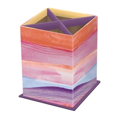 A square pencil holder in 8.5 x 11 cm format, with 4 compartments: ideal for storing and categorizing pens, rulers, scissors, etc. Made of durable cardboard and easy to handle The perfect accessory to personalize your workspace Removable and refillable cover for long time use Also available in different colours