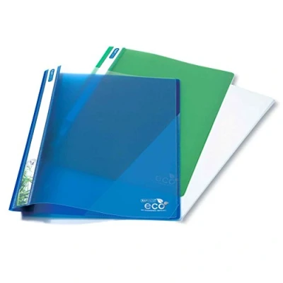A4 REPORT FILES - Pack of 10 report files with a flat two-hole fastening mechanism for securely filing punched papers and saving space ECO MATERIAL - Made from 100% bio-degradable polypropylene sheet material with carefully selected additives that ensure these files do not emit methane or any chemicals harmful to the soil during the bio-degradation process CAPACITY - Thin, easy-to-store files with a capacity of up to 30 sheets of 80gsm paper up to A4 in size with at least two punched holes EASY ORGANISATION - Crystal-clear transparent front cover allows the front page to be fully visible for easy identification and professional presentation of documents inside the folder and features a full-length removable label on the left edge of the front cover for clear organisation and personalisation CONVENIENT USE - Set of 10 A4 stylish ECO files in transparent assorted colours to suit any desk or shelf at home or in the office whilst the fastening mechanism keeps paper secure in transit