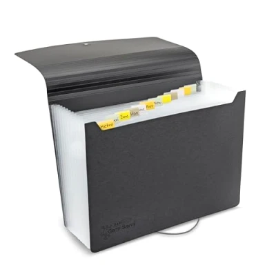 123inkYou can store all kinds of documents safely and conveniently in the black project folder from Rapesco. The 13 expandable, transparent inner compartments with coloured index tabs allow you to easily categorise your papers. A total of 910 A4 sheets will fit in this expandable compartments. Thanks to the antibacterial agent Germ-Savvy™, which is on the outside of the folder, bacteria don't stand a chance. In addition, the durable polypropylene, of which this project folder is made, is acid and PVC free. The flap with elastic closure and button closure ensure that you transport your documents neatly and dry in this sorting folder.
