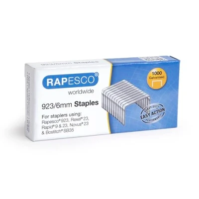 CONTENTS - Pack of 1000 type 923/6mm galvanised staples, designed for use in heavy-duty staplers KEY ELEMENTS - Premium quality, rust-resistant, heavy-duty staples featuring precision-cut legs with chisel points that provide easy penetration and a strong hold COMPATIBILITY - Compatible with the Rapesco heavy-duty stapler range and others, which take type 923/6mm staples (please always check compatibility with your stapler before purchasing) EQUIVALENT TO - Rexel No.23, Rapid type 9 and 23, Novus type 23, Bostitch type SB35 and Swingline Heavy Duty Staples USES - Popular for industrial stapling tasks, such as binding thick stacks of paper, securing cardboard, upholstery, and even some woodworking applications