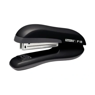 Ergonomically designed stapler for stapling up to 30 sheets of paper (80gsm), Ideal for everyday stapling at home, in the office or at school Adjustable anvil provides stapling and pinning functions in one stapler plus stapler can be used for tacking, Robust metal mechanism with plastic case and rubber grips for comfortable and precise stapling Comes pre-loaded with Rapid 26/6mm staples, Compatible with Rapid 24/6 and 26/6mm strong staples, Quick and easy top loading staple refill mechanism, Full strip staple capacity for longer stapling between refills Features a 72mm paper insertion depth for flexible stapling, 5 year guarantee when using Rapid staples Contents: 1 x Rapid F18 Full Strip Stapler, Metal, Rubber and ABS Plastic, Black, Dimensions (WxHxD): 47 x 76 x 167 mm, Weight: 200 g, 23811101